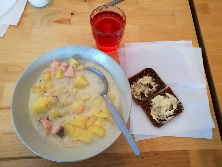 Päästiin pihaan ja astuttiin sisälle. Tiskiltä tilattiin aavistuksen hintava kalakeitto (10€) ja käytiin pöytään. Perus hyvää keittoa. Ehkä pieni pettymys, kun odotukset olivat aika korkealla.