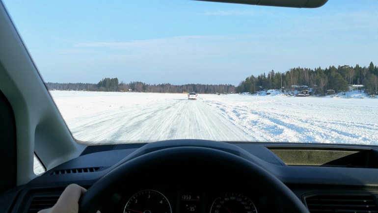Jäällä ajaminen pelottaa hieman. En tiedä miksi. En ole koskaan pudonnut (tai ajanut) jäihin, joten mitään järkevää selitystä tälle pelolle ei ole. Ajan mieluiten jäällä aina auton ikkunat auki, mutta lupasin Hennalle pitää ikkunat kiinni tällä reissulla.