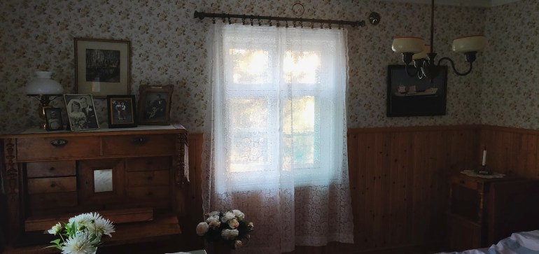 Itse mökki on hieno, taitaa mennä huvila-osastolle. Yövymme kuitenkin mökin vieressä pienessä punaisessa vierasmajassa. Joku voisi kutsua sitä myös aikakoneeksi, sillä sisustuksen ja seinillä olevien taulujen vuoksi tuntuu siltä, kuin olisi tullut 50-luvulle.