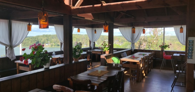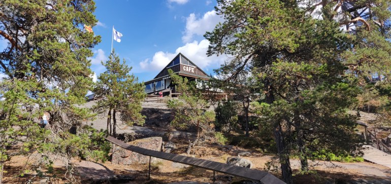 Iltapäiväkahvin aika. Tätä varten ajelimme lyhyen matkan linnalta hauskaan näköalakahvilaan, Uffe på Bergetiin. Paikka on ollut paikallaan pitkään ja lienee Ahvenanmaan legendaarisimpia taukopaikkoja. Näkötorni kohoaa vielä 30 metriä kahvilaa korkeammalle, mutta nykyisin sinne täytyy maksaa kahvilan kassaan parin euron pääsymaksu. Miinus vessoista, jotka ovat pönttöjen osalta huussi-mallia.