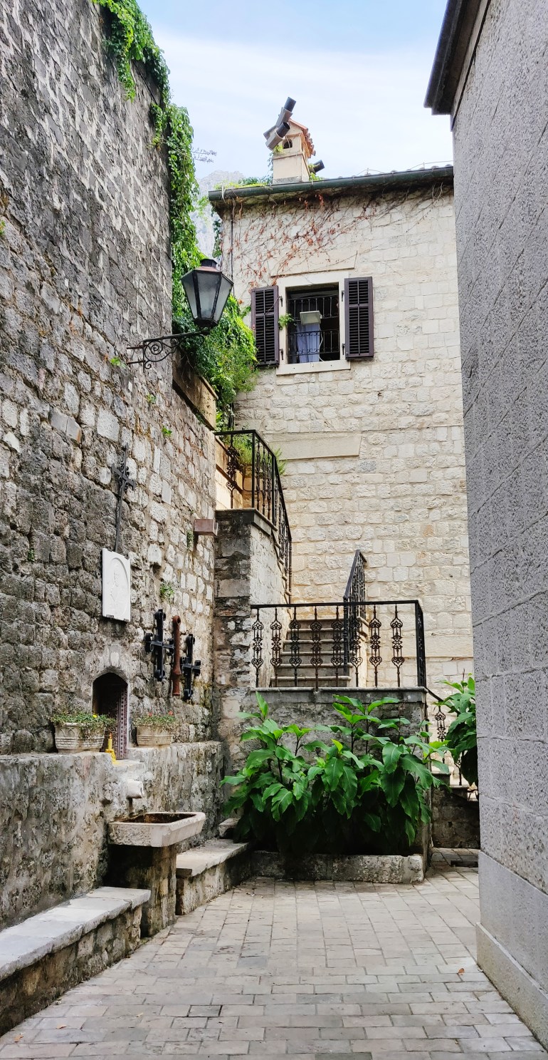 Kämpältä oli matkaa Kotorin vanhaan kaupunkiin muutama sataa metriä, joten sijainti oli mitä mainioin! Autollekin löytyi parkkipaikka suoraan pihasta, jonne meinasi olla ensimmäisellä yrittämällä vaikeuksia päästä. Tie oli niin jyrkkä, että hitaassa vauhdissa renkaat alkoivat sutimaan tyhjää ja piti hakea hieman alempaa vauhtia.