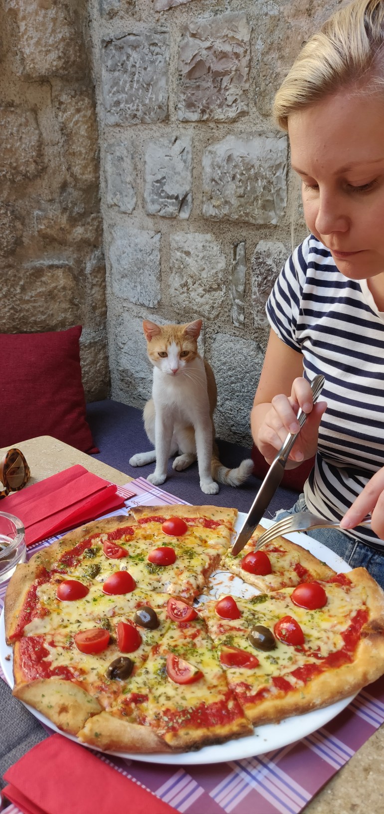 Lukuisat Kotorin ravintolat tarjoilevat välimerellistä ja/tai paikallista ruokaa, joka täällä on enimmäkseen kalaa. Ruokatarjonta on aika samanlainen kaikissa ravintoloissa: salaatteja, pastaa, risottoa, pizzaa ja tietysti niitä kalaruokia. Pitää sanoa, että ruoka ei tehnyt meihin erityisen suurta vaikutusta täällä. Yhtenä iltana maistoin paikallista liharuokaa, jonka nimeä en kuollaksenikaan enää muista. Kuulosti herkulliselta, mutta lopulta lautasella oli omituisen muotoinen köntti lihaa ja kaksi perunaa. Muina iltoina turvauduin pääasiassa pastoihin ja pizzoihin.