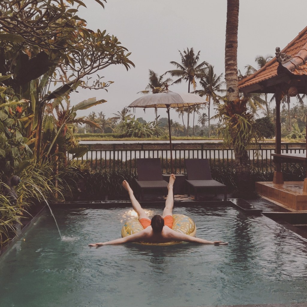 Krabilta lensimme Singaporeen ja sieltä edelleen Balille Denpasarin kentälle. Kentällä odotti villamme kuljettaja Putu, joka kuskasi meidät perille Ubudiin. Perillä meitä odotti oikein viihtyisä yksityinen villa riisipellon laidalta. Ubudissa majoitus on kohtuuhintaista ja vaikka tämä oli fasiliteeteiltaan selkeä upgrade Koh Mookin hotelliin, oli hinta vain murto-osan siitä.